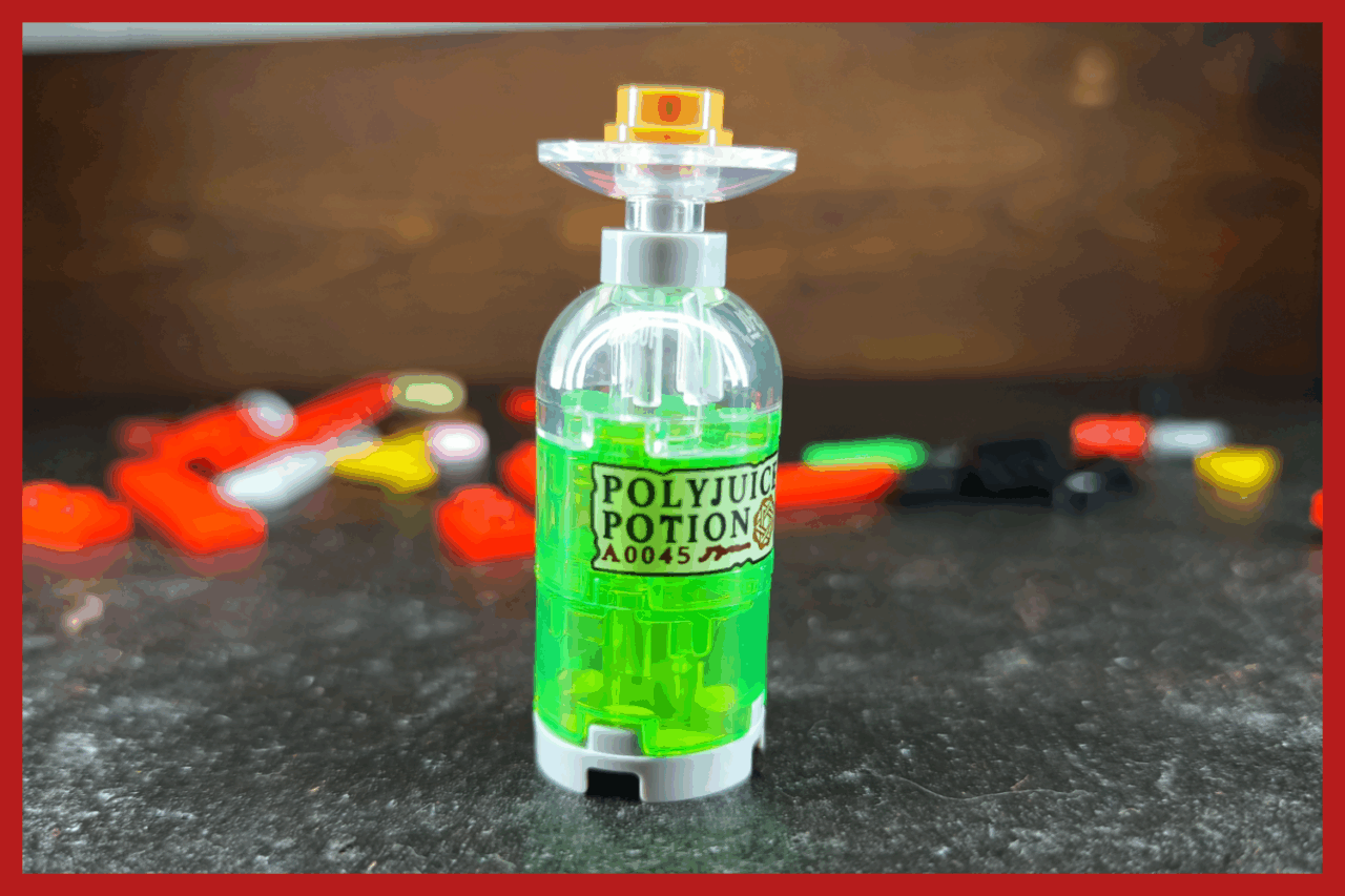 As you can see from the label, this is a bottle of Polyjuice Potion. And A0045, whatever that means. I absolutely see what they’re going for here, but it doesn’t read very well to me. The studs of the 2×2 round bricks interrupt the clean line you need to sell “bottle with liquid in it” and it ends up messy. Not their best.